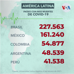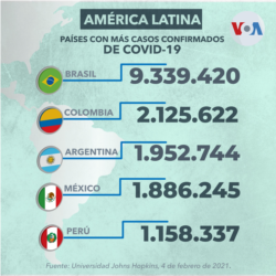Según la Universidad John Hopkins, Brasil, México, Argentina, Colombia y Perú son los países con más casos confirmados y fallecimientos, en la región.
