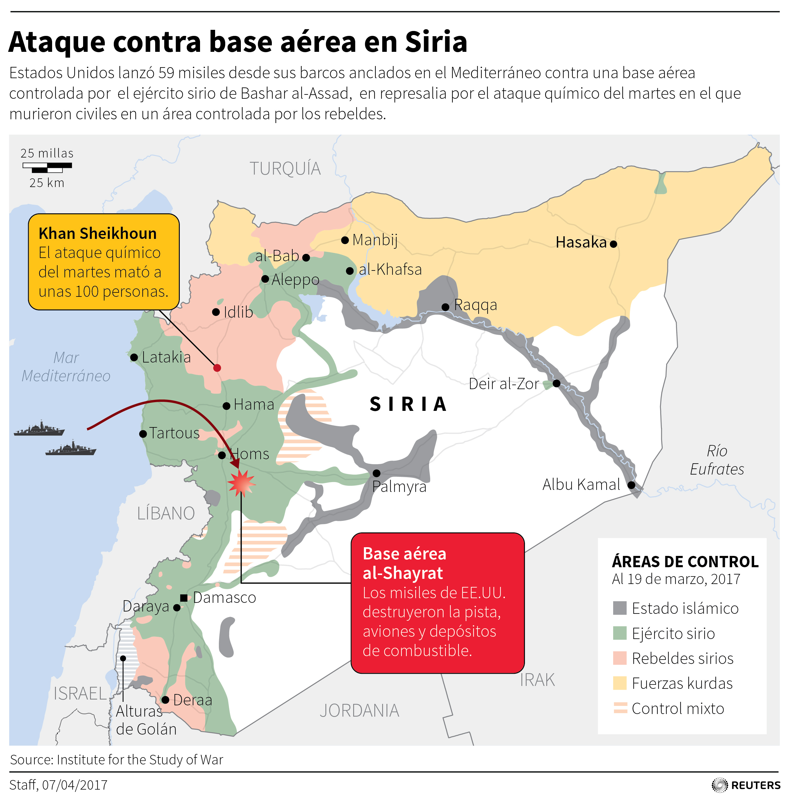 Los ataques estadounidenses —unos 59 misiles crucero Tamahawk lanzados desde los buques USS Ross y USS Porter desplegados en el Mediterráneo oriental— alcanzaron la base aérea de Shayrat, desde donde según funcionarios estadounidenses despegaron los aviones militares sirios que arrojaron los químicos que habrían matado a unos 100 civiles.