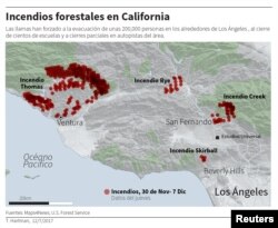 El fuego se propagó mientras los bomberos intentaban contener el mayor incendio en el estado, que ardía cerca de Ventura —a 209 kilómetros al norte—, destruyó 430 inmuebles y abarca 466 kilómetros cuadrados.