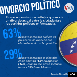 “Hace 10 años, el 80 % de los venezolanos se dividía entre chavistas y opositores. Hoy, ambos bloques son una minoría. Sumados los dos, llegan a 29 %. Es un tercio de la población”, indicó Seguías en conversación con la VOA.
