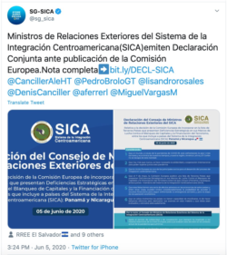 El Sistema de la Integración Centroamericana (SICA) pidió el viernes a la Unión Europea (UE) que dé marcha atrás en su decisión de incluir a Panamá y Nicaragua en la "lista gris" de países con deficiencias contra el blanqueo de dinero y la financiación del terrorismo.