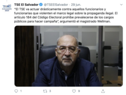 El TSE hizo un llamado a los partidos a abstenerse de hacer propaganda entre la población y solo pedir el voto a sus afiliados respetando así el artículo 81 de la Constitución de la República y los artículos 175 al 179 y 226 al 231 del Código Electoral para evitar sanciones.