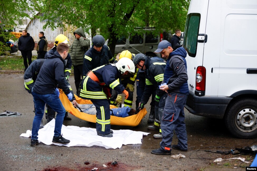 Los rescatistas cargan el cuerpo de una mujer muerta en el lugar de un ataque con misiles rusos, en Chernihiv, Ucrania, el 17 de abril de 2024. REUTERS/Valentyn Ogirenko