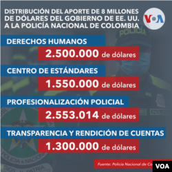 Por su parte, el general Jorge Luis Vargas, director de la Policía Nacional, agradeció el apoyo por parte de EE. UU. y dijo que, con el equipo de Bogotá y el equipo de transformación, el aporte estará destinado para generar, con el Alto Comisionado de Derechos Humanos, "la certificación, los cambios y los fortalecimientos para que todos los policías de Colombia tengan como base de su actuar el respeto de los derechos humanos".