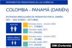 El COVID-19 obligó a migrantes a suspender sus planes debido a las restricciones, llevó a otros a optar por viajes arriesgados como atravesar el Tapón del Darién, lo que aumentó el empleo de traficantes en la región. Unos 178.867 adultos entraron irregularmente a Panamá a través de la selva del Darién entre enero y octubre de 2022, el 70 % de ellos eran venezolanos, según datos del informe de tendencias migratorias de OIM.