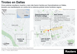 Los disparos comenzaron en torno a las 8:45 p.m. de la tarde del jueves, cuando cientos de personas se manifestaban por las muertes en tiroteos policiales esta semana en Baton Rouge, Louisiana y un suburbio de St. Paul Minnesota.