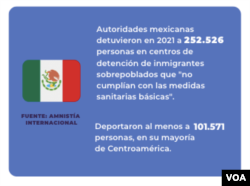 Datos de Amnistía Internacional revelan que autoridades mexicanas detuvieron en 2021 a 252.526 personas en centros de detención de inmigrantes sobrepoblados “que no cumplían con las medidas sanitarias básicas” y deportaron al menos a 101.571 personas, en su mayoría de Centroamérica.