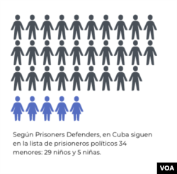 La institución basada en Madrid señala que hay en total 34 menores entre los prisioneros políticos de Cuba, 29 niños y 5 niñas. De ellos 27 estarían cumpliendo condena y 7 de ellos estarían siendo procesados penalmente.