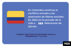 En Colombia continúa el conflicto armado y los asesinatos de líderes sociales. En 2022 se ha privado de la vida a 169 defensores de DDHH, según el Instituto de Estudios para el Desarrollo y la Paz.