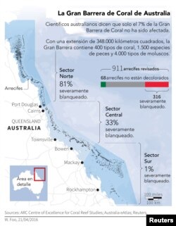 "El blanqueo que estamos viendo en este momento en la Barrera es de gran preocupación y vuelve a enfatizar la necesidad urgente de reducir la emisión de gases invernadero", dijo David Wachenfeld, jefe de científicos de la Autoridad del Parque Marino de la Gran Barrera de Coral, a la cadena ABC.
