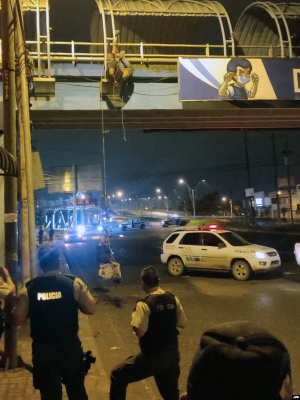 El inusual hallazgo de dos cadáveres suspendidos de una cuerda en un puente peatonal sorprendió a los ecuatorianos este lunes, evocando el estilo de crímenes de los carteles mexicanos.