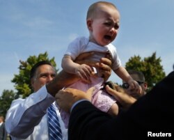 El candidato presidencial republicano, Mitt Romney, devuelve a un bebé que lloró cuando intentó cargarlo durante su acto de campaña en Springfield.