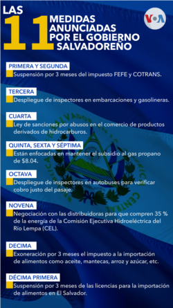 Por su parte Napoleón Campos, especialista salvadoreño en Relaciones Internacionales e integración regional, detalló a Voz de América que las medidas “son parciales” ya que para tener un mayor impacto debían “derogarse (transitoriamente) todos los decretos legislativos que sostienen la canasta de impuestos sobre los combustibles refinados, sobre el consumo final de los combustibles refinados”.