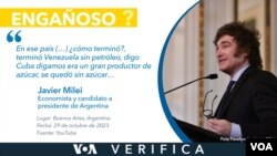 Gonzalo Monroy, especialista y consultor en temas del sector energético, dijo a la Voz de América que el discurso de Milei puede ser considerado “exagerado”. Si bien la producción de petróleo en Venezuela y de azúcar en Cuba son significativamente menores que años atrás, no son nulas.