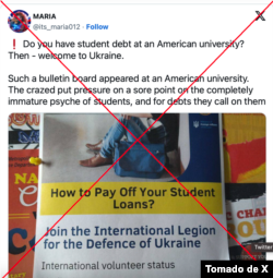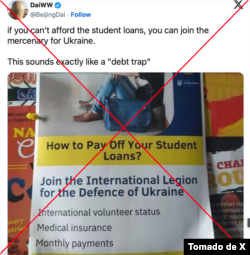 “¿Cómo liquidar sus préstamos estudiantiles? Únase a la Legión Internacional para la Defensa de Ucrania”.