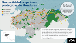 Las 74 áreas naturales protegidas de Honduras pierden cada año miles de hectáreas ante la toma ilegal de tierras, tala de bosques, asentamientos humanos, cría de ganado y construcción de pistas de aterrizaje para narcoavionetas que hacen escala en su ruta hacia México y Estados Unidos.
