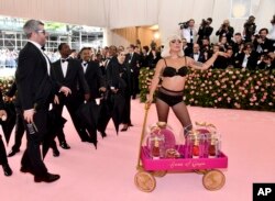 La Gala del Museo Metropolitano de Nueva York se inició el lunes con un gran momento, Lady Gaga caminó por la alfombra rosada luciendo largas pestañas doradas y un enorme vestido fucsia, que luego se despegó capa por capa hasta que llegó a un Sujetador, bragas y medias caladas.