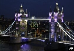 A 17 días de la inauguración de los Juegos Olímpicos 2012, Londres está lista. Los anillos gigantes, que son totalmente retráctiles para permitir a los buques de altura para pasar a través del puente, se mantendrán en posición durante la duración de los juegos.