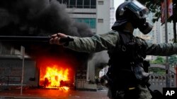 Manifestantes y policías se enfrentaron en Hong Kong por segundo día consecutivo el domingo, empujando al caos el área de negocios y compras de la ciudad y generando temores de escenas aún más violentas antes del Día Nacional de China esta semana.