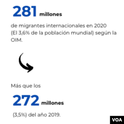 El “Informe sobre las Migraciones en el Mundo 2022” de la OIM reporta que en 2020 había aproximadamente 281 millones de migrantes internacionales, una cifra que equivale al 3,6 % de la población mundial.