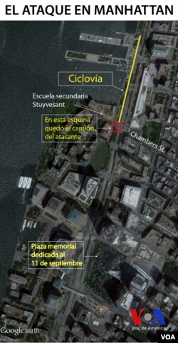 Según la policía, Saipov alquiló la camioneta alrededor de las 14:00 horas en Nueva Jersey, e ingresó a la ciclovía una hora después en West Street, a unas cuadras del nuevo World Trade Center —sitio del ataque terrorista más letal en la historia de Estados Unidos.