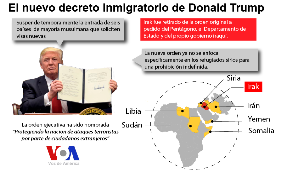 Pero Iraq, que estaba originalmente en la lista de países prohibidos, fue retirado de la orden original después de acordar aumentar su cooperación con el gobierno estadounidense para la investigación de sus ciudadanos que soliciten una visa de viaje.