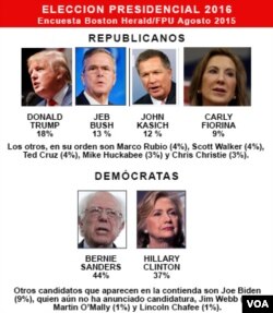 De acuerdo a una nueva encuesta del Boston Herald/FPU sobre las preferencias en el estado de New Hampshire, escenario de la segunda elección primaria, el senador Bernie Sanders supera a Hillary Clinton en el lado demócrata mientras en el republicano Trump y Bush están adelante, pero les siguen muy de cerca dos candidatos que nadie esperaba: John Kasich y Carly Fiorina.
