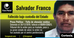 Aunque en noviembre del 2020 un tribunal ordenó trasladarlo para que fuera sometido a una revisión médica, Franco nunca fue atendido. Murió en el Internado Judicial Rodeo II, cerca de Caracas, el 3 de enero de 2021, por desnutrición, choque séptico y edema cerebral asociado a tuberculosis. Las causas de la muerte figuran en su certificado de defunción y la información fue divulgada por Alfredo Romero, director presidente del Foro Penal.