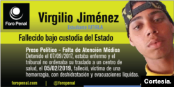 El joven falleció el 5 de febrero de 2019 tras presentar una “hemorragia con deshidratación y evacuaciones liquidas”. De acuerdo con el Observatorio Venezolano de Prisiones (OVP), dos semanas antes de morir, Jiménez se comunicó con sus familiares para informarles que presentaba fiebre y pidió medicamentos y alimentos.