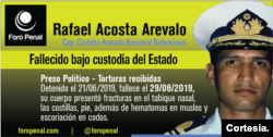 Defensores de derechos fundamentales denunciaron que el capitán Acosta fue trasladado a tribunales en silla de ruedas, presentando graves signos de tortura (fractura de tabique nasal, costillas fracturadas, fractura en pie, hematomas en muslos y escoriación en codos). De acuerdo con la versión, no hablaba, pero pedía auxilio a su abogado y el juez ordenó trasladarlo a un centro asistencial, donde falleció en el 29 de junio de 2019.