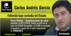 Carlos Andrés García era concejal de Guasdualito, en el estado Apure. Fue detenido el 17 de diciembre de 2016 después de que las autoridades le incautaran una suma “sospechosa” de dinero en efectivo y acusado de instigación pública y saqueos registrados en el contexto de manifestaciones en esa población.