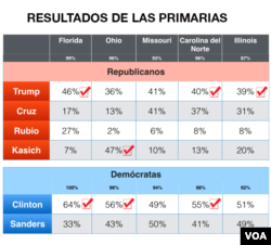 En la competencia republicana, el magnate republicano Donald Trump ganó las primarias de Florida, Illinois y Carolina del Norte y de paso acabó con las pretensiones presidenciales del senador Marco Rubio.