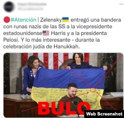 Otro ejemplo de esta narrativa es la desinformación que circuló tras la visita de Zelenskyy a Estados Unidos en diciembre de 2022. De acuerdo con varios usuarios, el mandatario habría recibido una bandera ucraniana con el emblema de las SS.
