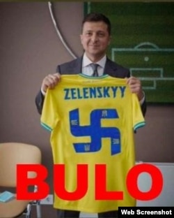 Por ejemplo, en los primeros meses de conflicto se viralizó con rapidez una imagen de Zelenskyy sosteniendo una camiseta con una esvástica en el reverso. Se trata de la camiseta de la selección ucraniana con el apellido de Zelenskyy.