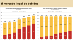 “El 20 % del mercado está copado por el consumo ilegal de bebidas alcohólicas, donde el 13% corresponde al consumo ilegal de cerveza y el 7 % a otras bebidas. En 2022, el fisco boliviano perdió 218,6 millones de dólares en recaudación por el contrabando de bebidas alcohólicas”, dijo Espinoza.