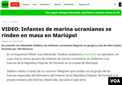 El Canal 6 de propiedad del estado, en la sección internacional del noticiero del pasado 6 de abril, presentó como noticia una supuesta rendición masiva de 160 infantes de Marina ucranianos. Mientras el video rodaba, el periodista leía el texto publicado por RT en su portal web: “…varios grupos de infantes de Marina ucranianos se rindieron ante las fuerzas de la República Popular de Donetsk en la ciudad de Mariúpol…”, decía el presentador de Noticiero 6.