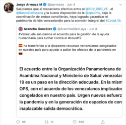 El jueves, la Ministra de Relaciones Exteriores de España, Arancha González, ya había anunciado la decisión: “España ha transferido a la OPS recursos venezolanos congelados en nuestro país para ayudar a paliar los efectos de la pandemia en Venezuela”.