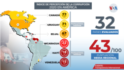 América tiene una puntuación media de 43 de 100 puntos, por quinto año consecutivo, por eso fue calificada por el informe como un “escaparate de corrupción y mala gestión de fondos en una de las regiones peor afectadas por la COVID-19”.