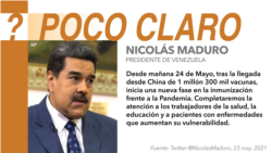 El periódico El Nacional de Venezuela reporta que Maduro anunció a fines de abril que habían llegado 930.000 dosis de vacunas. Sin embargo, un día después, el ministro de Salud, Carlos Alvarado, dijo que la cifra era de 1.48 millones. Alvarado no especificó cuántas provenían de China o Rusia, los dos proveedores de Venezuela, ni cuándo llegaron.